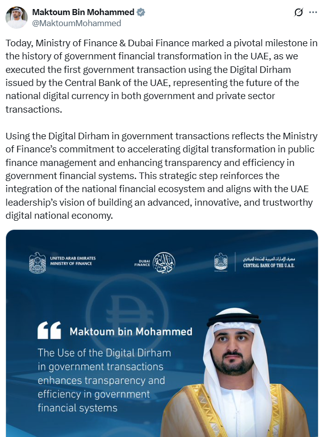 The Ministry of Finance and Dubai Finance announced the update on Tuesday, describing the pilot as “a step towards broader adoption of the national digital currency across both government and private sector operations.” The move represents the first tangible progress since the Central Bank of the UAE (CBUAE) revealed in March that it aimed to begin the rollout of the digital dirham in the fourth quarter of 2025.