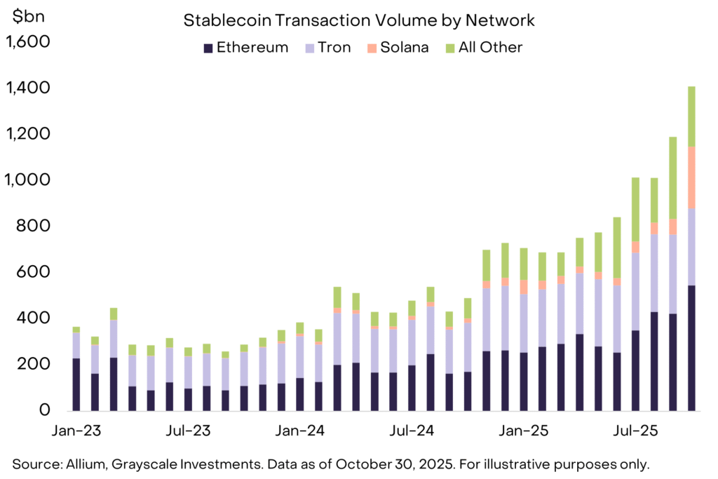 While equities struggled to find direction, stablecoin adoption hit new highs. According to Allium data, monthly transaction volumes reached $1.4 trillion, with total supply exceeding $300 billion for the first time — much of it driven by Solana’s network efficiency. Major payment firms including Mastercard, Visa, and Western Union announced strategic stablecoin initiatives, signaling institutional confidence in blockchain-based payments.