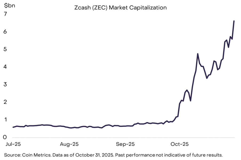 Amid a broadly weaker crypto market, Zcash (ZEC) emerged as a standout performer, surging 248% in October to a $6.5 billion market cap. Its appeal lies in optional privacy features via shielded transactions — now used by nearly 30% of holders, up from 10% in 2024.